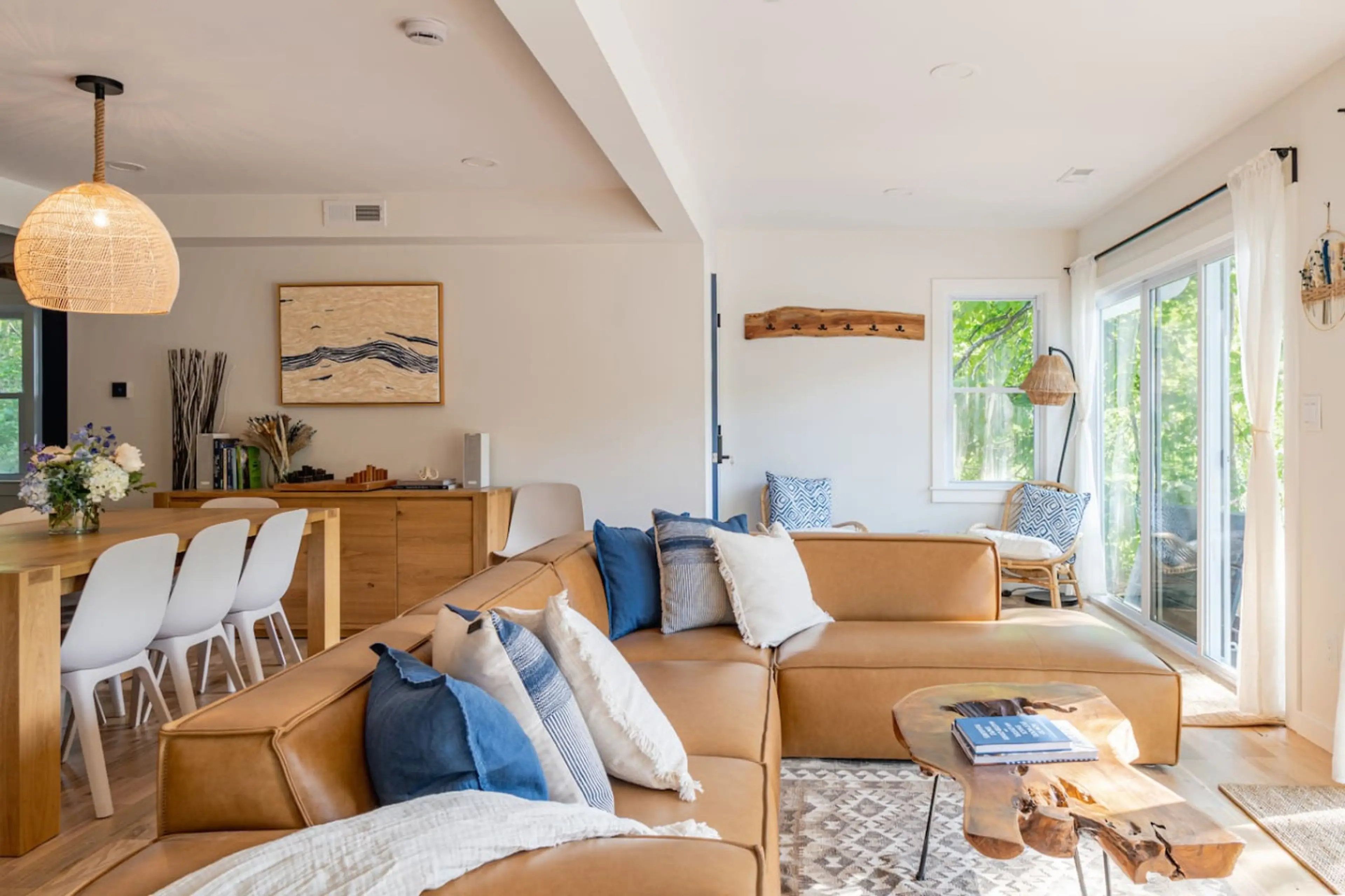 Experience nature & waterfront living at The Overlook at Esopus Creek — our modern, elevated retreat in Saugerties, NY features a sun drenched open layout, sliding glass doors w/ water views, elevated kitchen with white quartz waterfall island, outdoor patio area overlooking the Esopus Creek, a dedi...